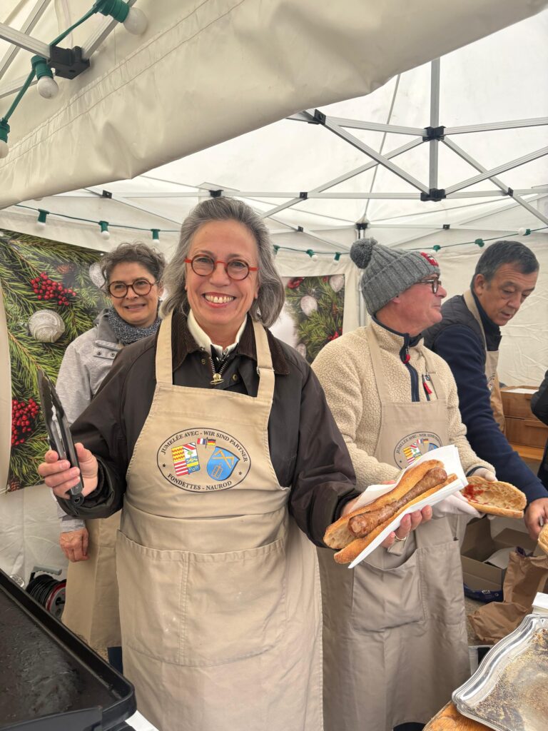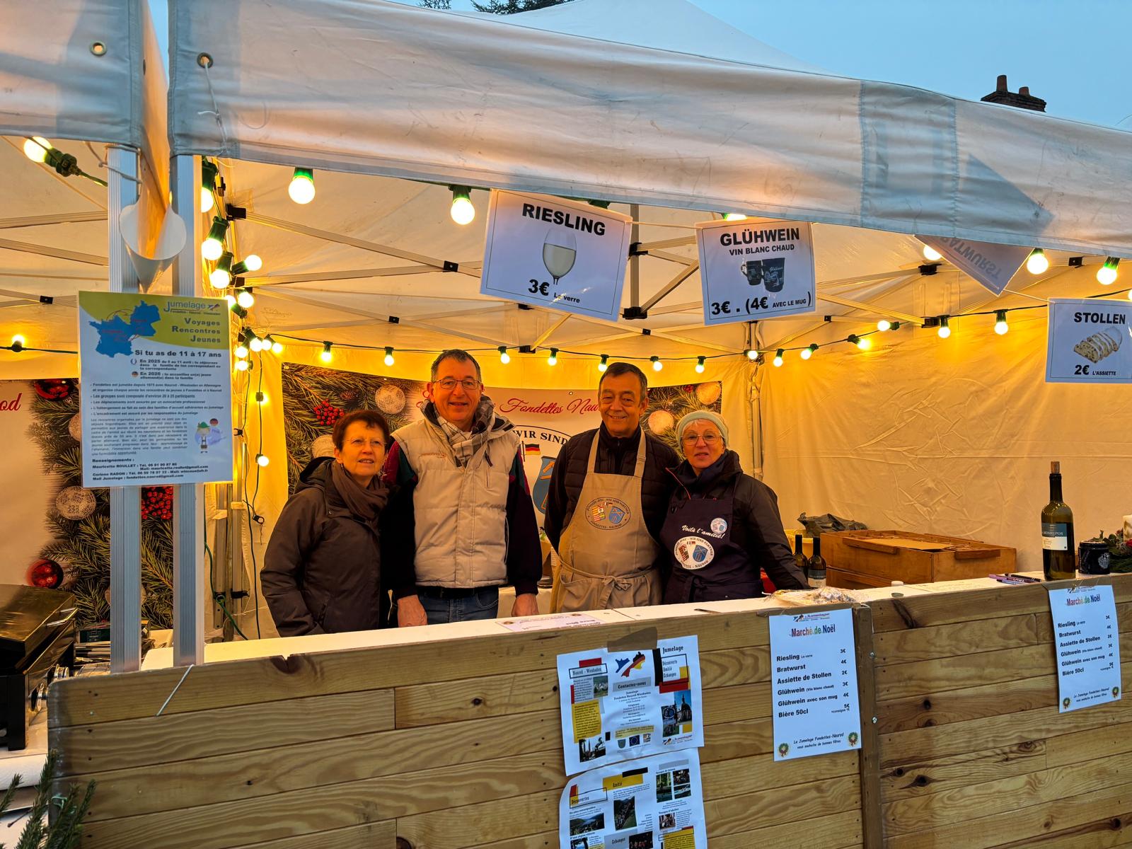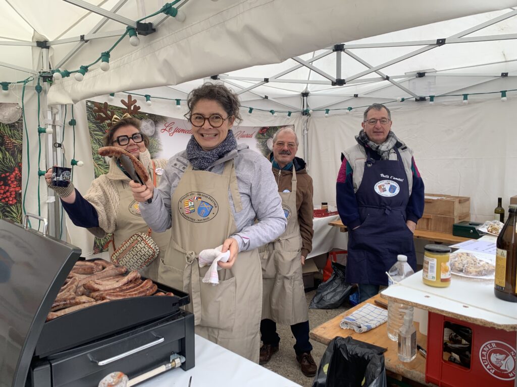 Tous les stands alimentaires ayant été regroupés autour d’une place aménagée de tables et de chaises pour accueillir les visiteurs, notre stand a bénéficié de cette nouvelle disposition et cette nouvelle visibilité pour faire le plein d’amateurs de nos spécialités allemandes, Bratwurst, glüwein, et riesling.