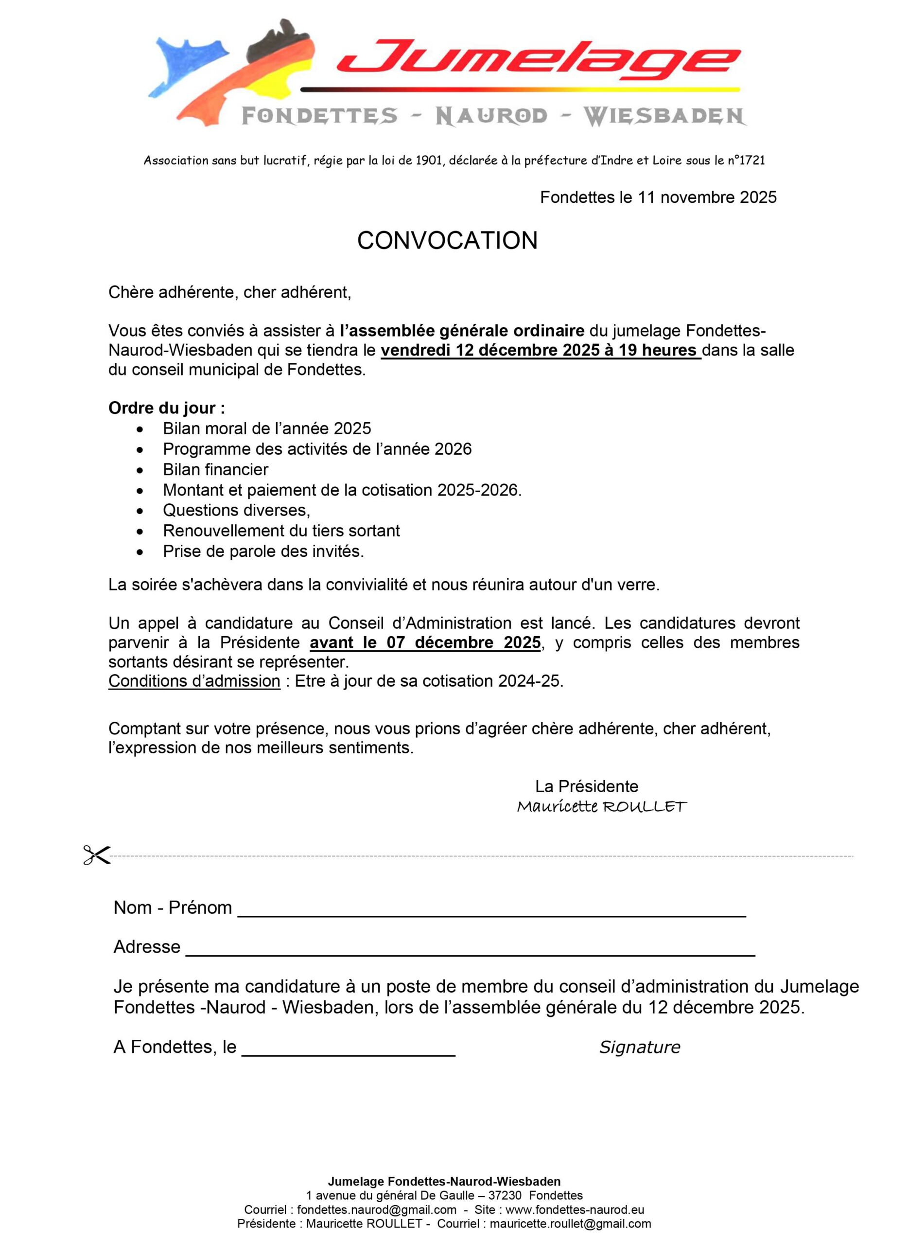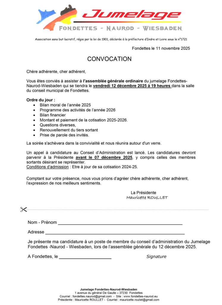 19 novembre 2025 Jean Luc Actualités Assemblée Générale le 12 décembre à 19h salle du Conseil Municipal à Fondettes
